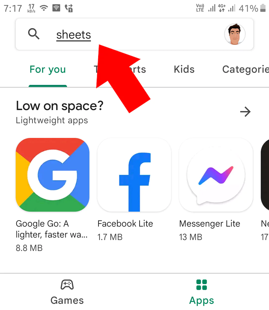 در برنامه فروشگاه عبارت sheets را جستجو کنید و از لیست پیشنهادی گزینه اول یا google sheets را انتخاب کنید